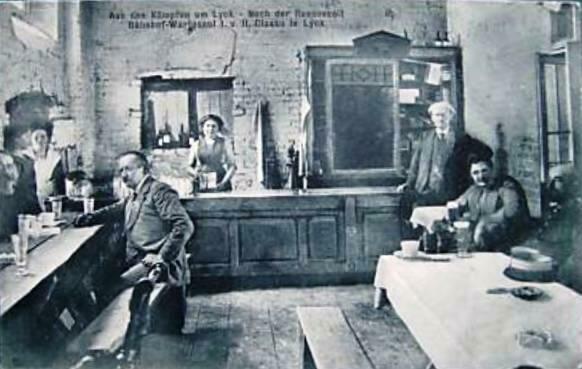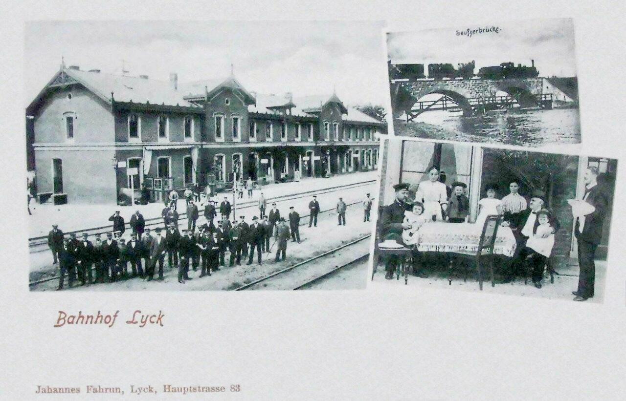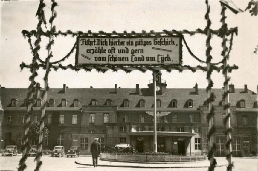 Dworzec w Lyck (Ełku). Czasy panowania III Rzeszy (na "bramie" widoczna flaga ze swastyką). Drewniany stelaż ozdobiony girlandami i tablica z napisem witają/ żegnają podróżnych. "Führt Dich hierher ein gütiges Geschick, erzähle oft und gern vom schönen Land um Lÿck" w wolnym tłumaczeniu oznacza "Jeśli doprowadził cię tu dobry los, często i chętnie opowiadaj o pięknej ełckiej krainie".