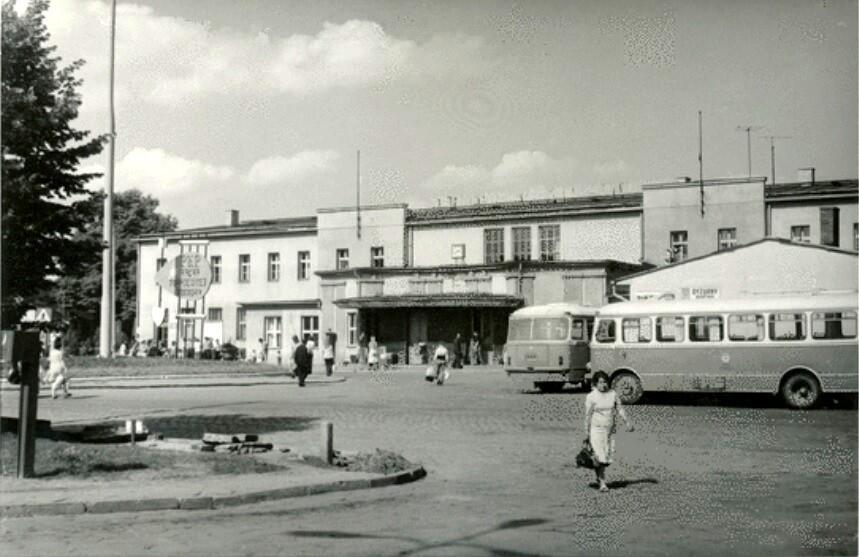 Dworzec w Ełku. Jak widać, w epoce PRL-u, plac przed dworcem, podobnie jak w chwili obecnej, pełnił funkcję przystanku dla autobusów. Na zdjęciu widać PKS-owskie autokary, prawdopodobnie marki SAN H-100.