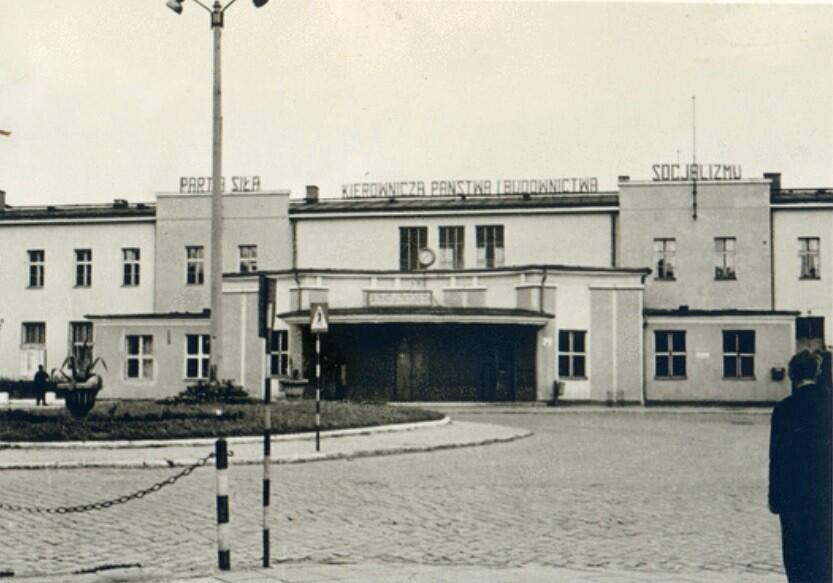 Dworzec w Ełku z propagandowym napisem na dachu: "PARTIA SIŁĄ KIEROWNICZĄ PAŃSTWA I BUDOWNICTWA SOCJALIZMU".