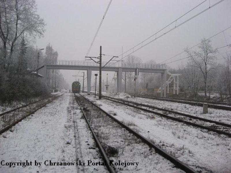 Widok na remontowaną kładkę od strony wjazdu z Chrzanowa. Za nią znajduje się peron.