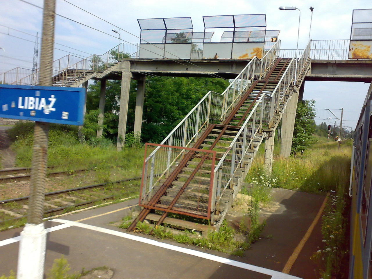 Wejście na kładkę nad torami z jedynego peronu. Widok w kierunku Chrzanowa.