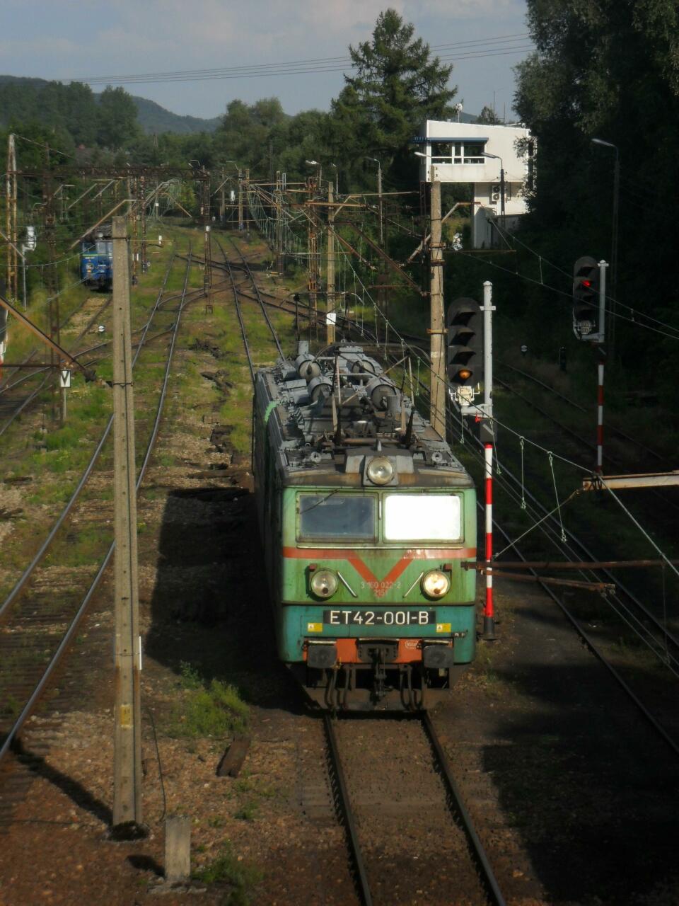 ET42-001 na stacji Libiąż, w tle nastawnia dysponująca "Li". Widok w kierunku Chrzanowa.