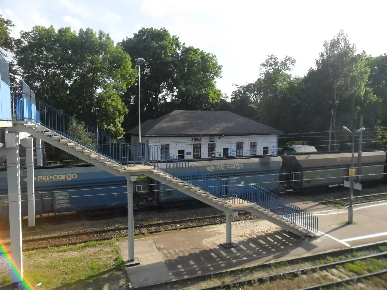 Budynek dworca Libiąż - widok z końca kładki, w lewo Chrzanów, w prawo Oświęcim.