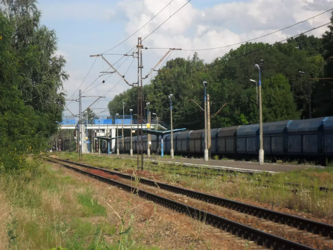 Widok w oddali na zachodnią głowicę stacyjną stacji Libiąż - widok z kładki w stronę Oświęcimia.
