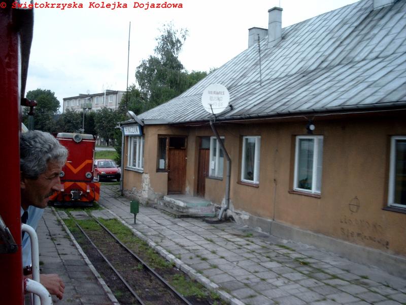 Stacja (nieczynna), przystanek osobowy Pińczów - plac ładunkowy, budynek stacyjny. Pociąg MS 2606 relacji Wiślica - Jędrzejów Wąskotorowy, prowadzony lokomotywą Lxd2-296. Widok w kierunku stacji Wiślica.