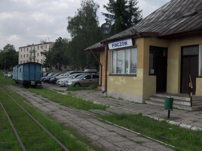 Stacja (nieczynna), przystanek osobowy Pińczów - budynek stacyjny, w lewo - kierunek Umianowice, w prawo - kierunek Wiślica.