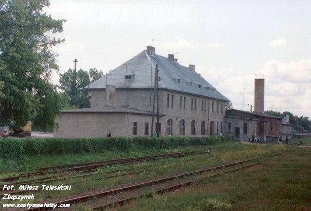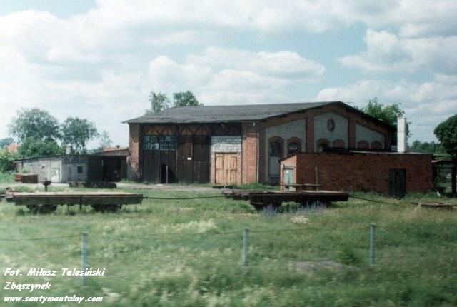 W głębi majaczą relikty części trakcyjnej - wieża wodna i parowozownia.