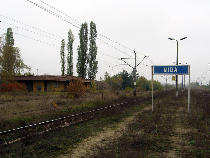 Nieczynny budynek dworcowy stacji Nida: w prawo Sitkówka-Nowiny/Kielce, w lewo Włoszczowice.