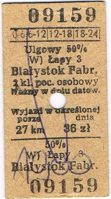 Bilet kolejowy Łapy - Białystok Fabryczny 26. IX. 1991 r.