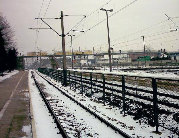 Widoczne perony stacji: 1 - dalszy i 2 - bliższy, oraz schody na kładkę. Budynek dworca znajduje się tuż za lewą ramką kadru.