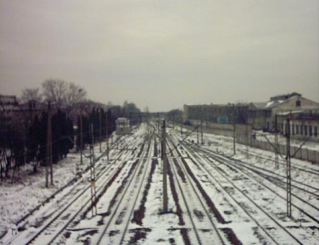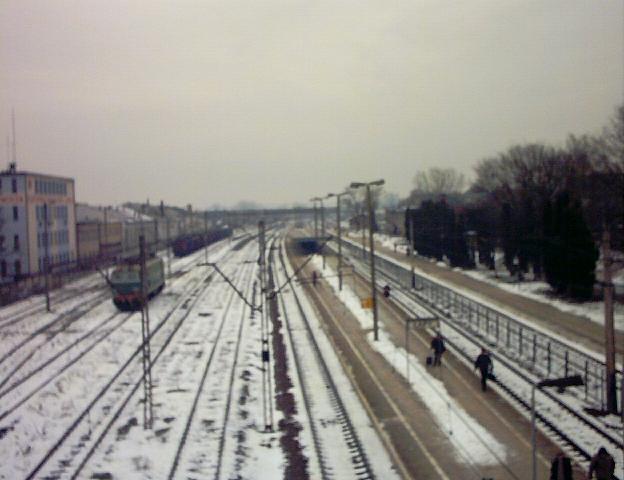 Widok z peronu 1 w kierunku północno-wschodnim (Białystok). Zaśnieżony tor, z którego odjeżdżały pociągi do Ostrołęki/Olsztyna (do tyłu zdjęcia).
