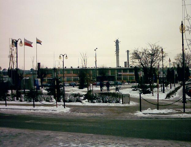 Budynek dworca od strony miasta. Przed dworcem jest plac parkingowy oraz mini plac manewrowy dworca PKS.