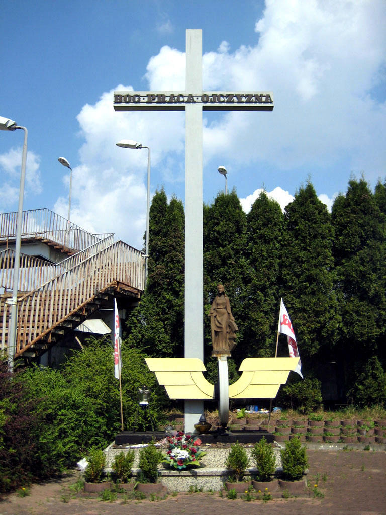 Stacja PKP Łapy. Krzyż "kolejarski" przed wejściem do ZNTK.