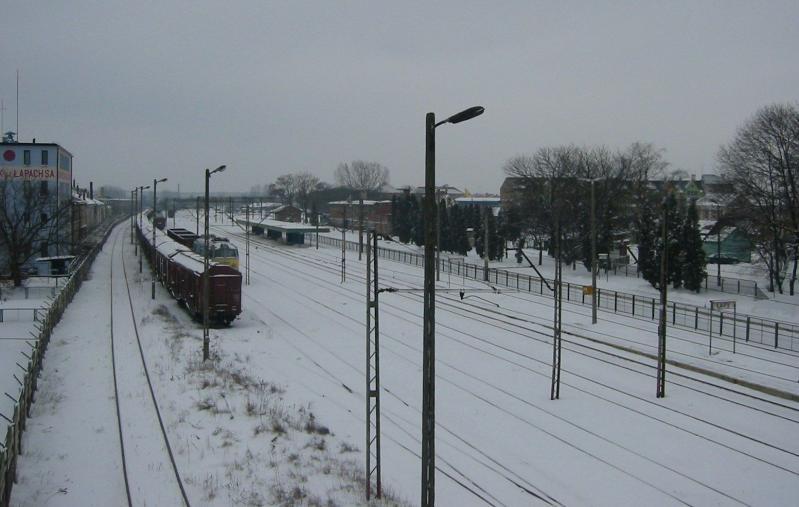 Widok na stację z kładki nad torami od strony wjazdu z Białegostoku. Po prawej stronie widoczny w oddali budynek dworca PKP i wiata na peronie Nr 2, z lewej strony poza wygrodzeniem teren ZNTK S.A. Łapy. Kierunek południowo-zachodni.