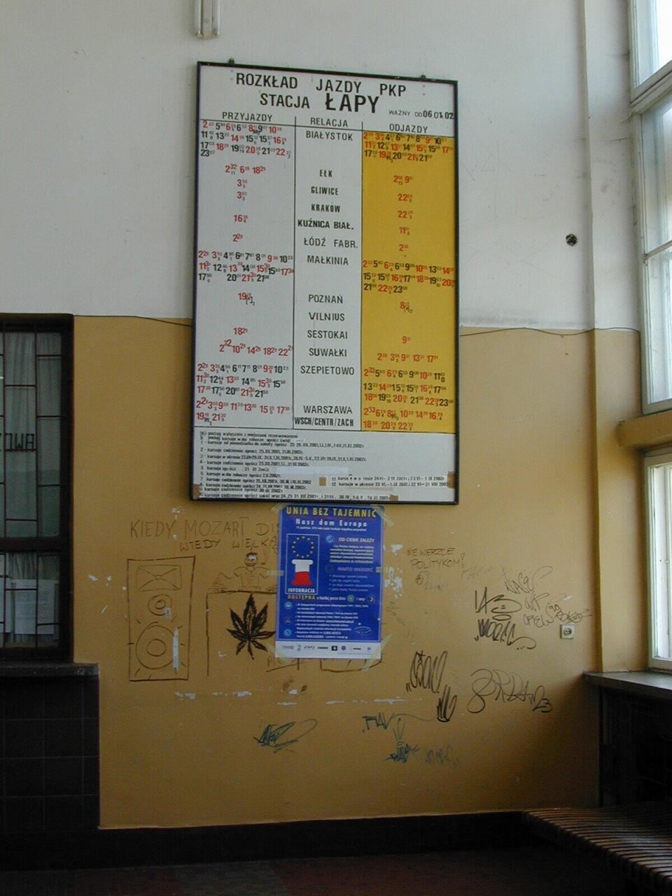 Rozkład jazdy w holu kasowym dworca w Łapach. Po lewej okienka kasowe, po prawej okno z widokiem na plac przed dworcem. Patrzymy w kierunku Warszawy.