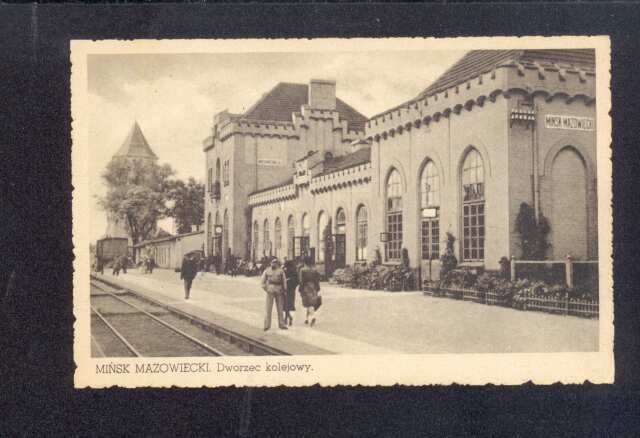 Mińsk Mazowiecki. Widok z widokówki, to juz tylko historia. Zdjęcie przedstawia nieistniejącą zabudowę stacyjną - dawny dworzec i wieżę ciśnień. W latach 70. i na początku 80. XX w (?) stacja została gruntownie przebudowana. Powstał nowy dworzec (wspólny PKP i PKS), przebudowano perony. Stary dworzec i wieżę ciśnień wyburzono (wieża obecnie widoczna ze stacji jest wieżą miejską, nie kolejową). W internecie znajdowała sie kiedyś wiadomość, że w związku z przebudową stacji (?), w 1999 r. firma (wojskowa?) Spec-Min ze Szczecina wyburzyła sposobem minerskim fundamenty dawnej wieży ciśnień - 51 m3. Wartość tej pracy wynosiła 11199,60 pln.