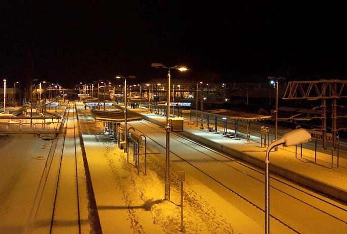 Stacja w śniegu. Widok z kładki w stronę Siedlec.
