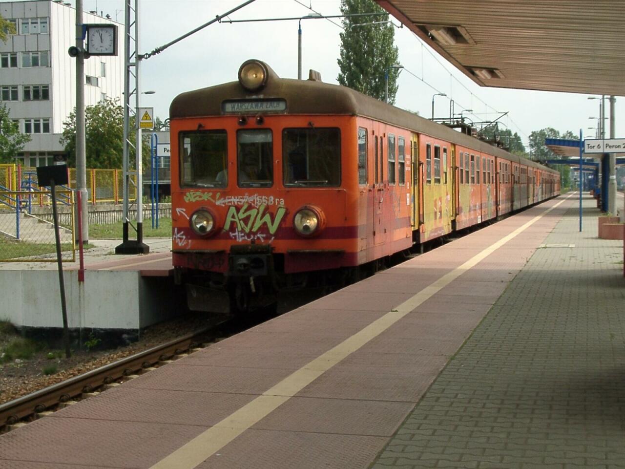 Mińsk Mazowiecki. EN57-1568, jako pociąg do Warszawy Zachodniej, odjeżdża z peronu 1/2.