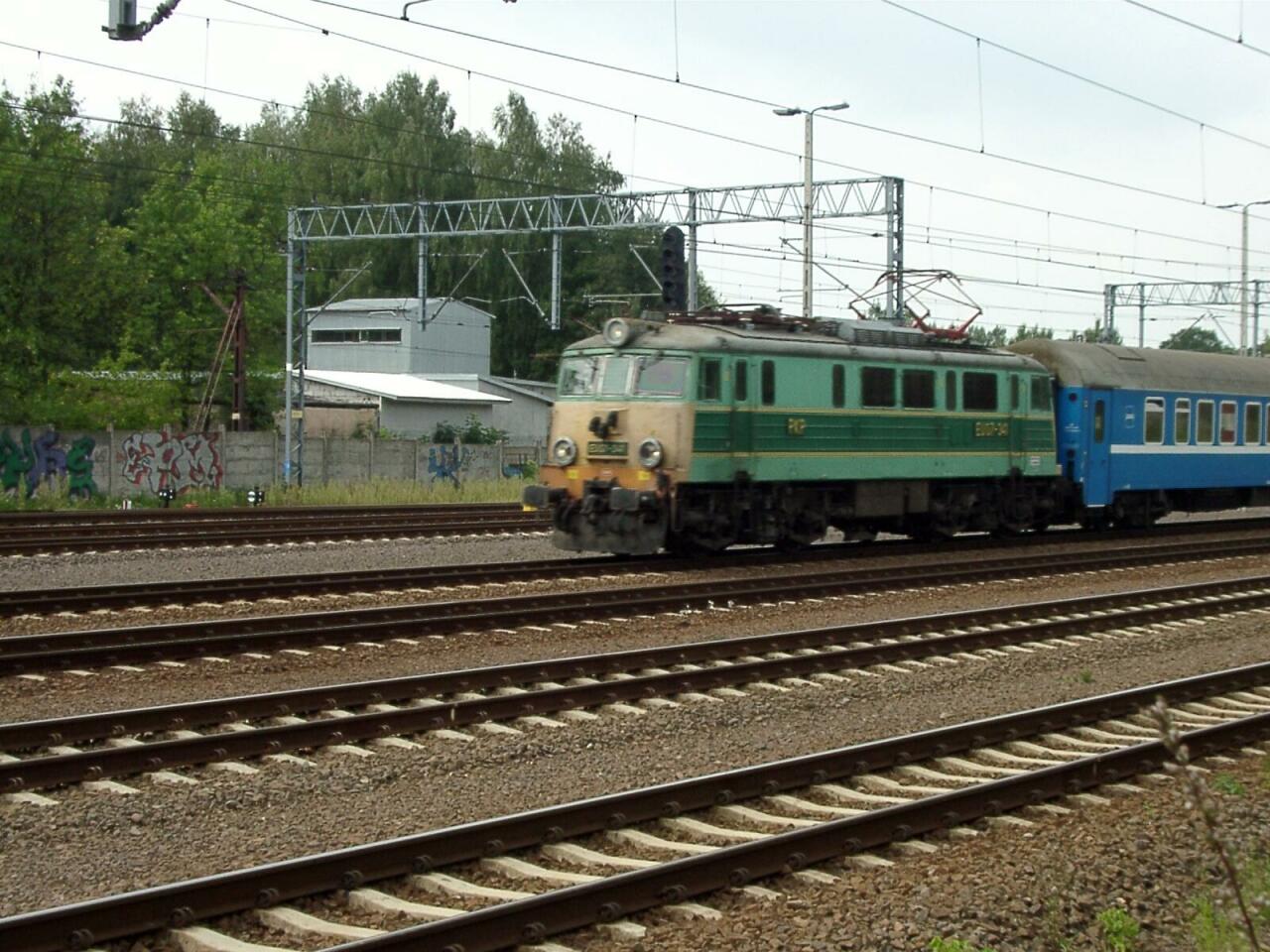 Mińsk Mazowiecki. EU07-347 wjeżdża na stację ze składem międzynarodowym. W tle d.ZNTK.
