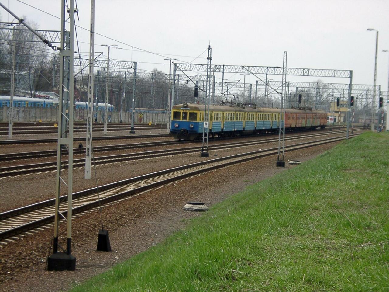 Mińsk Mazowiecki. Wyremontowane EN57 opuszczają d.ZNTK. Przy peronie skład z tłuczniem.