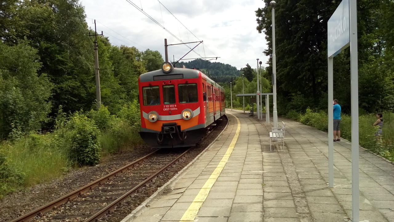 Stacja Hucisko ze składem EN-57 zmierzającym w kierunku Suchej Beskidzkiej. Widok w kierunku Żywca.