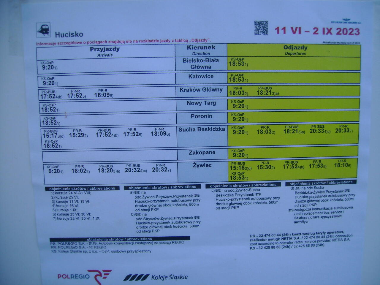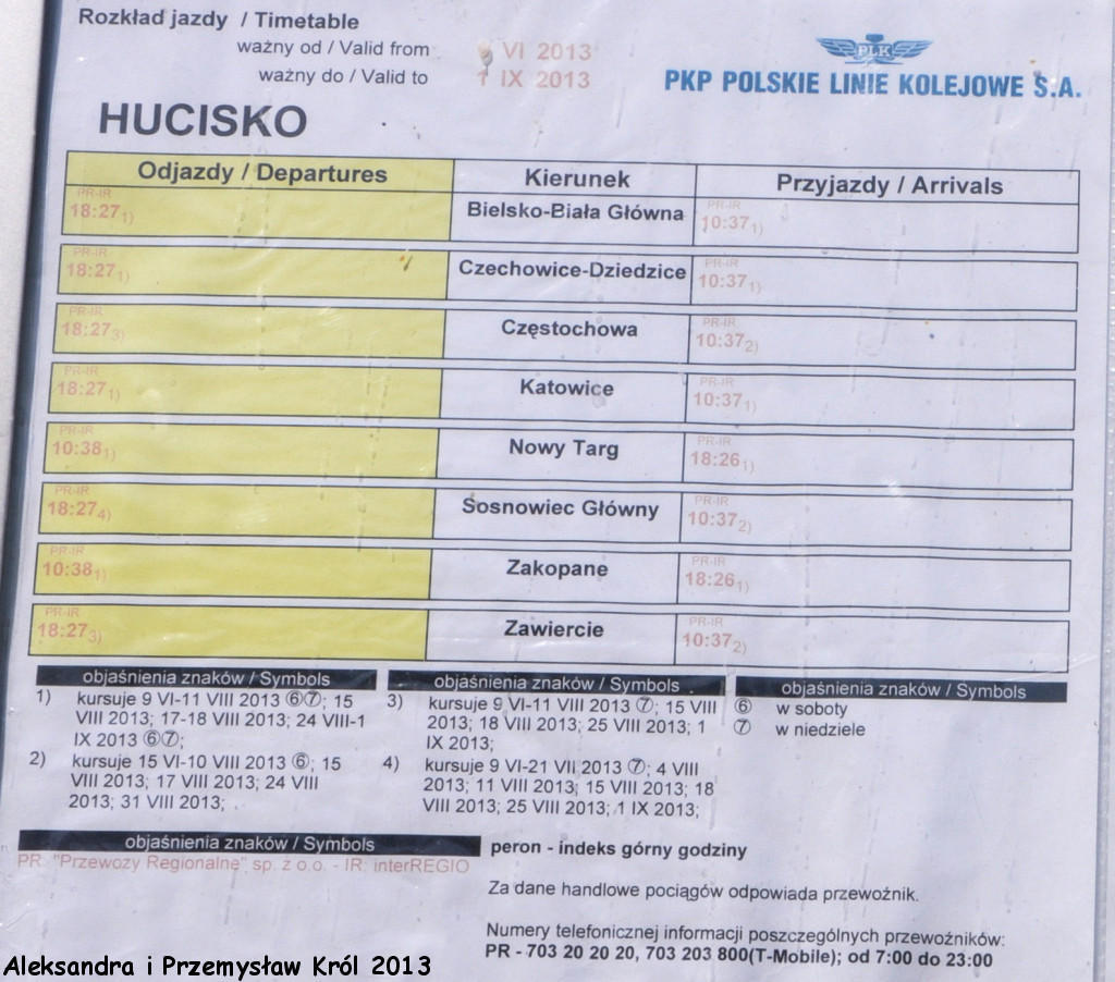 Rozkład jazdy na budynku dworcowym. Na pierwszy rzut oka na bogato, a tak naprawdę to tylko 1 para pociągów w wakacje, i 1 para w piątki i niedziele w roku szkolnym…