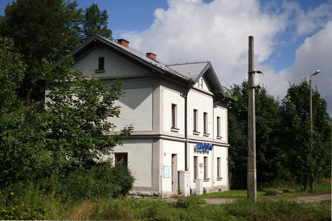Hucisko - dawny budynek dworca w całej okazałości. Widok od strony peronu; w lewo Żywiec, w prawo Sucha Beskidzka.