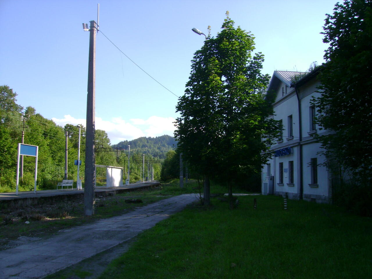 Budynek dworca. Widok od strony peronu; w lewo Żywiec, w prawo Sucha Beskidzka.