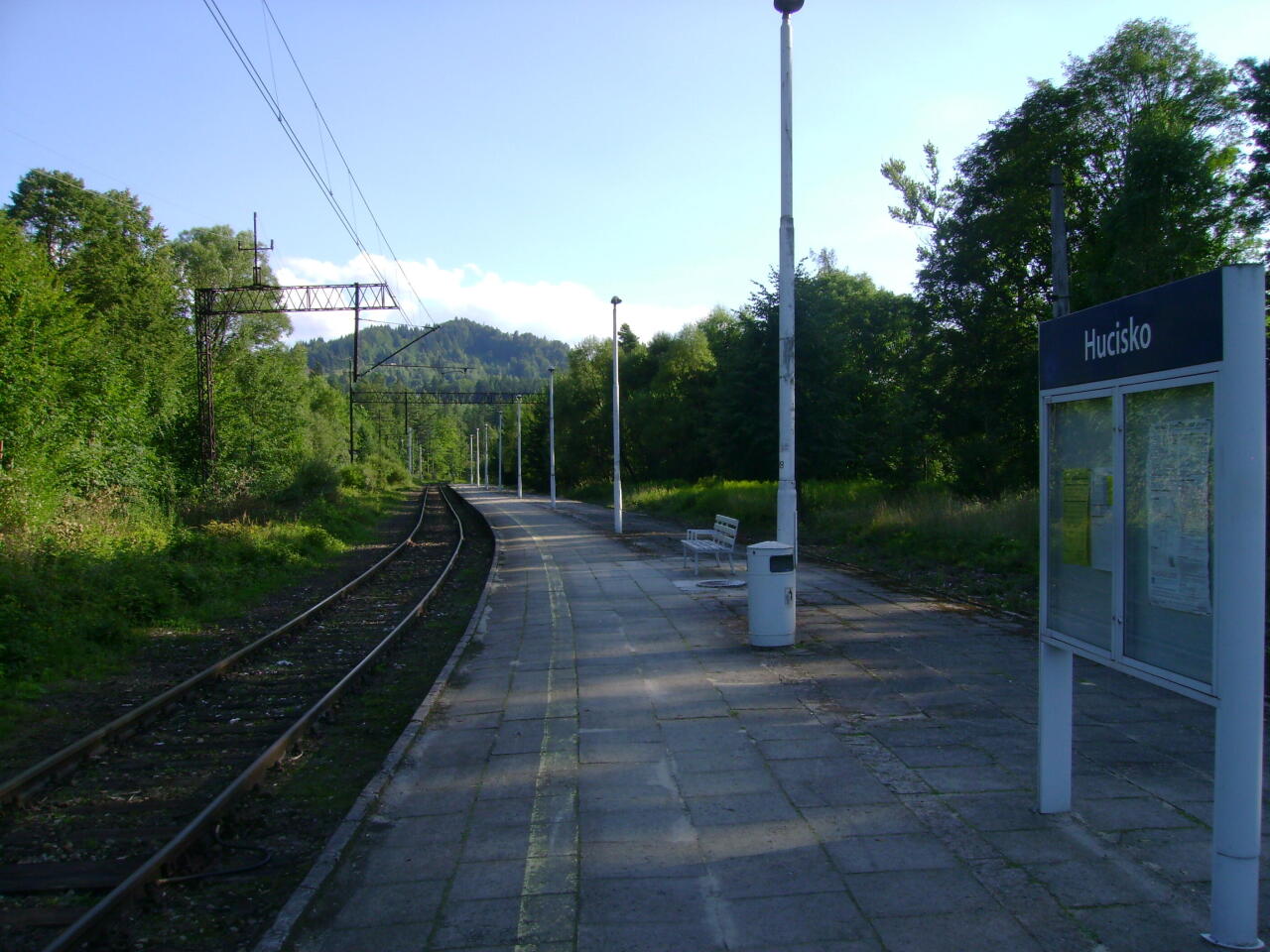 Hucisko. Widok w kierunku Żywca. Po lewej stronie oraz z prawej strony, za peronem starotorze po torach dodatkowych.
