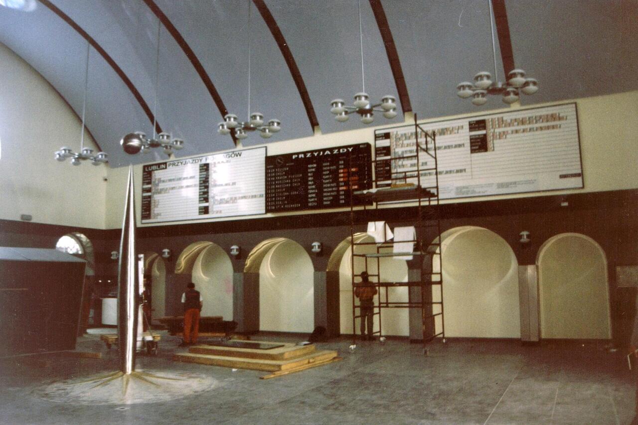 Przygotowanie tablicy rozkładów jazdy po remoncie poczekalni.