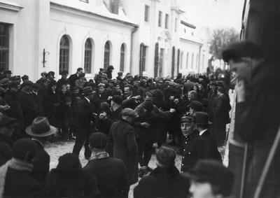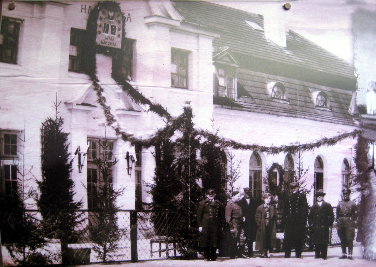 Dekoracja budynku dworca na Święto 3 Maja w w okresie międzywojennym. Zdjęcie pochodzi z wystawy w muzeum Kolejki Leśne.