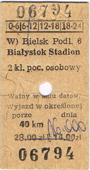 Bilet kolejowy Bielsk Podl. - Białystok Stadion 13. II. 1994r.