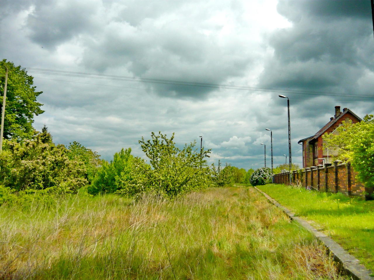 Widok na stację od strony wschodniej (od Rokietnicy). Po lewej tor "główny". Po prawej boczny. Tor boczny od przu przejeździe nieprzejezdny - brak odcinka torów. Po lewej budynki stacyjne. W tle budynek główny.