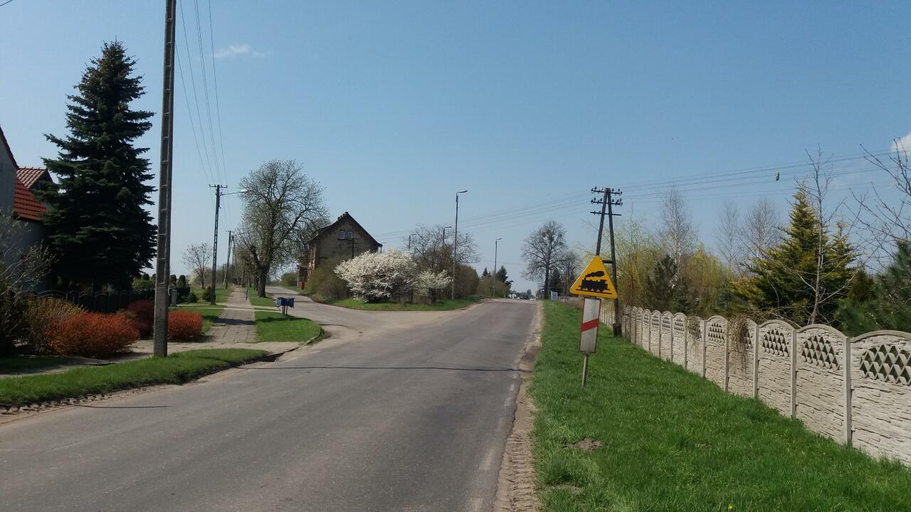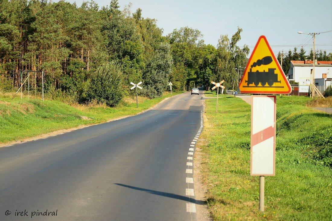 Ul. Dworcowa w Kaźmierzu, zjazd w lewo prowadzi do stacji. Znak ostrzegawczy przed przejazdem.