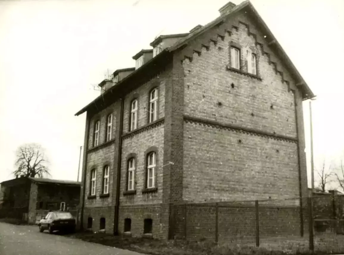 Kolejowy budynek mieszkalny z lat 1910-1920 na zdjęciu z początku lat dziewięćdziesiątych widziany od strony ulicy w kierunku Skwierzyny.