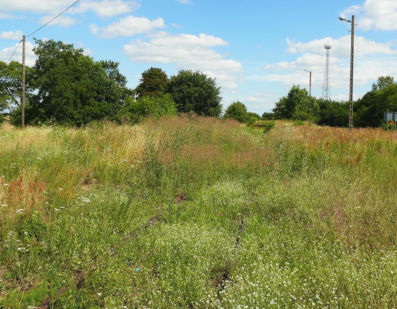 Wjazd na dawną stację od strony Szamotuł. W tle, po prawej toalety i dworzec. Tory wyglądają na przejezdne, ale są zarośnięte trawą (na razie).