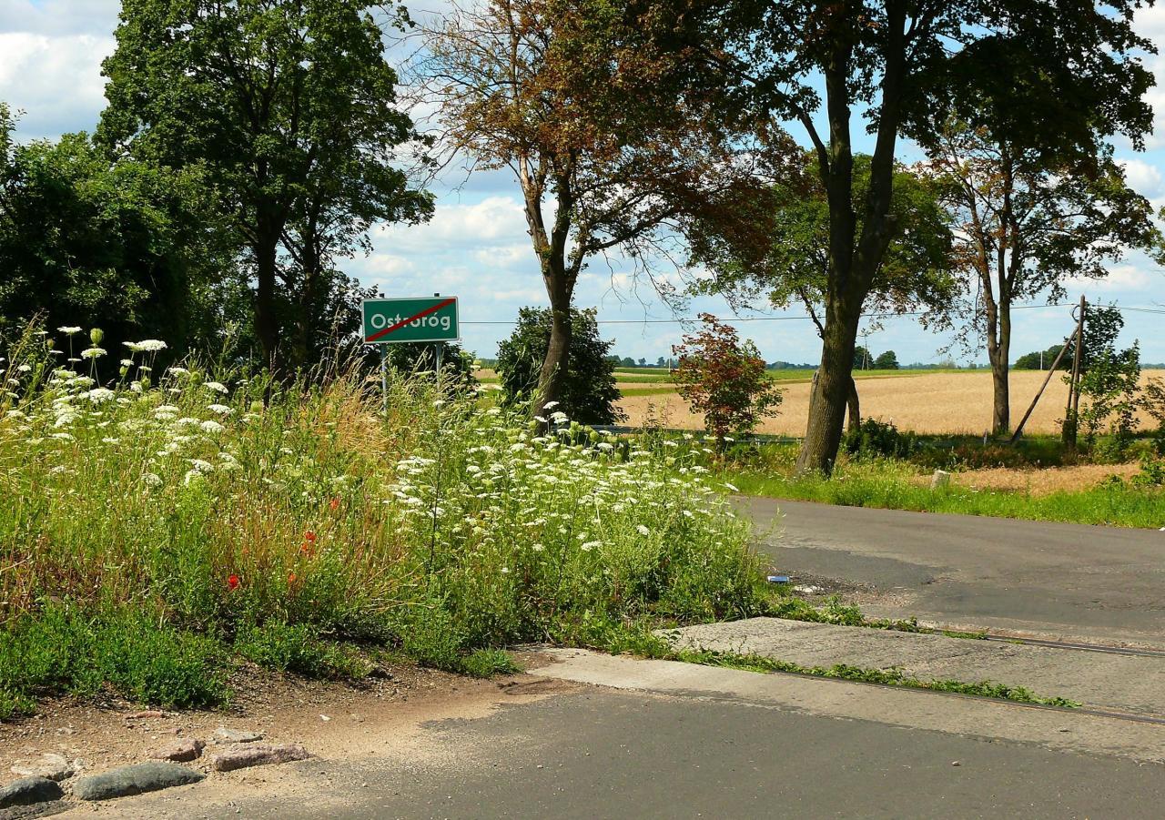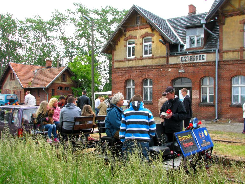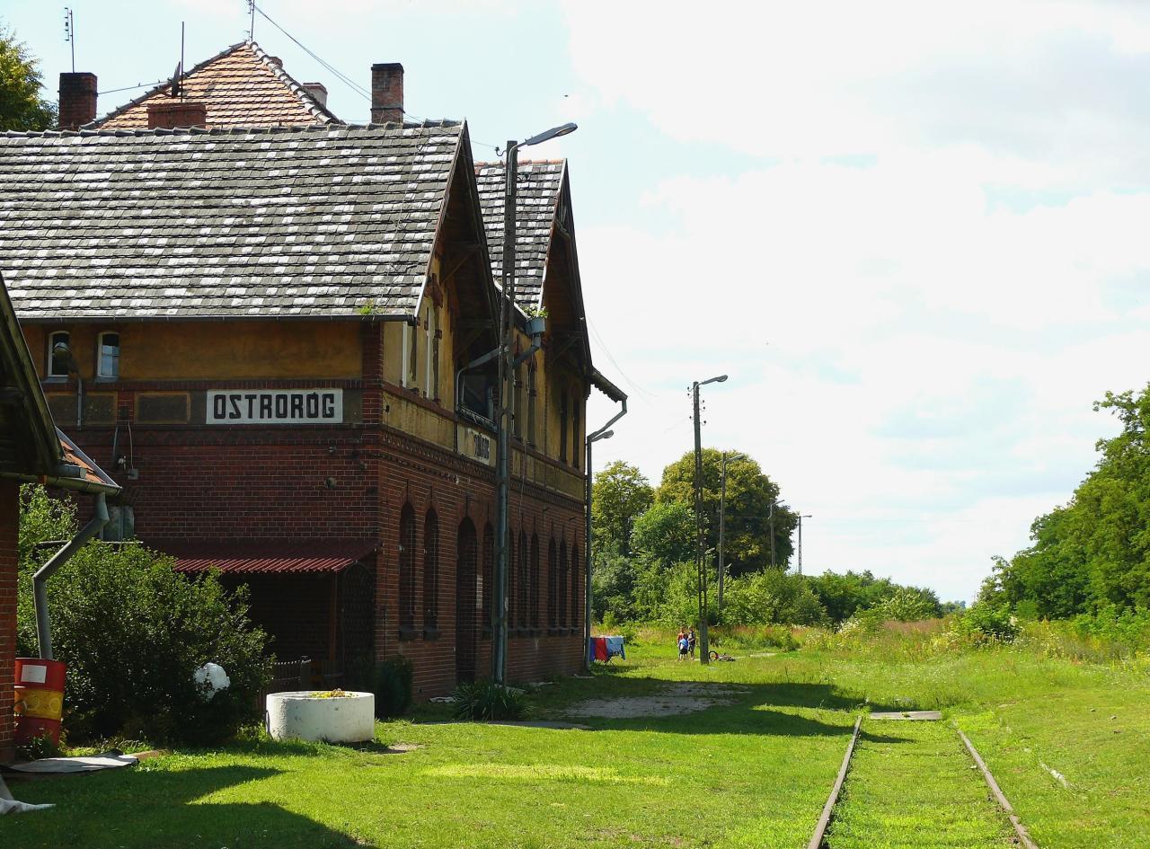 Po kilkunastu latach zwrotnicę udało się uruchomić. Znowu można jechać na bok. Przygotowania do imprezy z okazji 600-lecia Ostroroga. Imprezę na stacji organizuje Nadwarciańska Kolej Drezynowa. W tle toalety i dawny dworzec. Wjazd od strony Szamotuł.