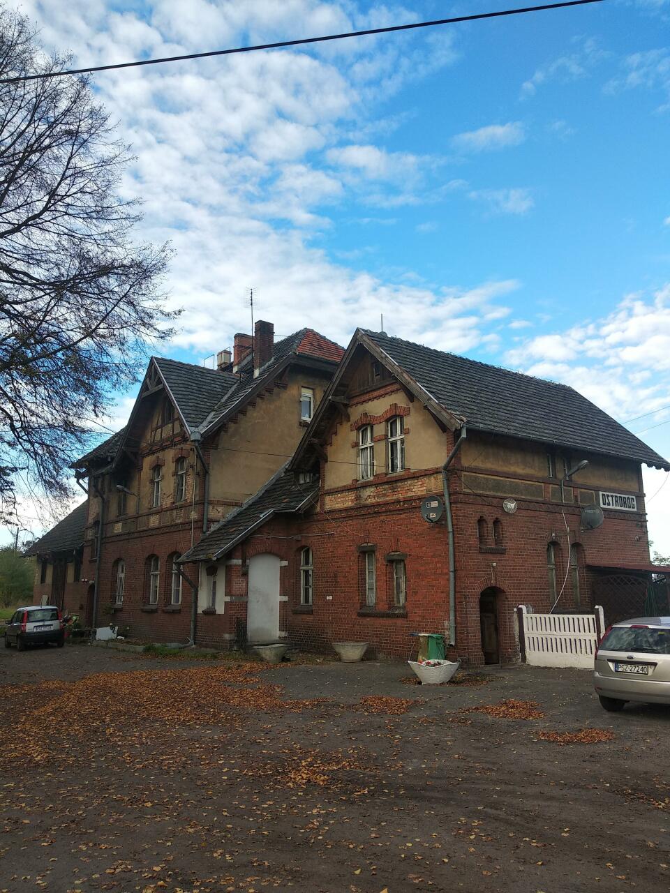 Opuszczony przez PKP i częściowo zaadaptowany na mieszkania dworzec na dawnej stacji w Ostrorogu. Widok od strony peronu i wjazdu z Szamotuł.