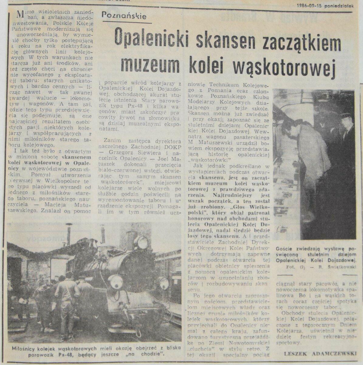 Artykuł o opalenickiej kolei wąskotorowej w gazecie z 1986r.