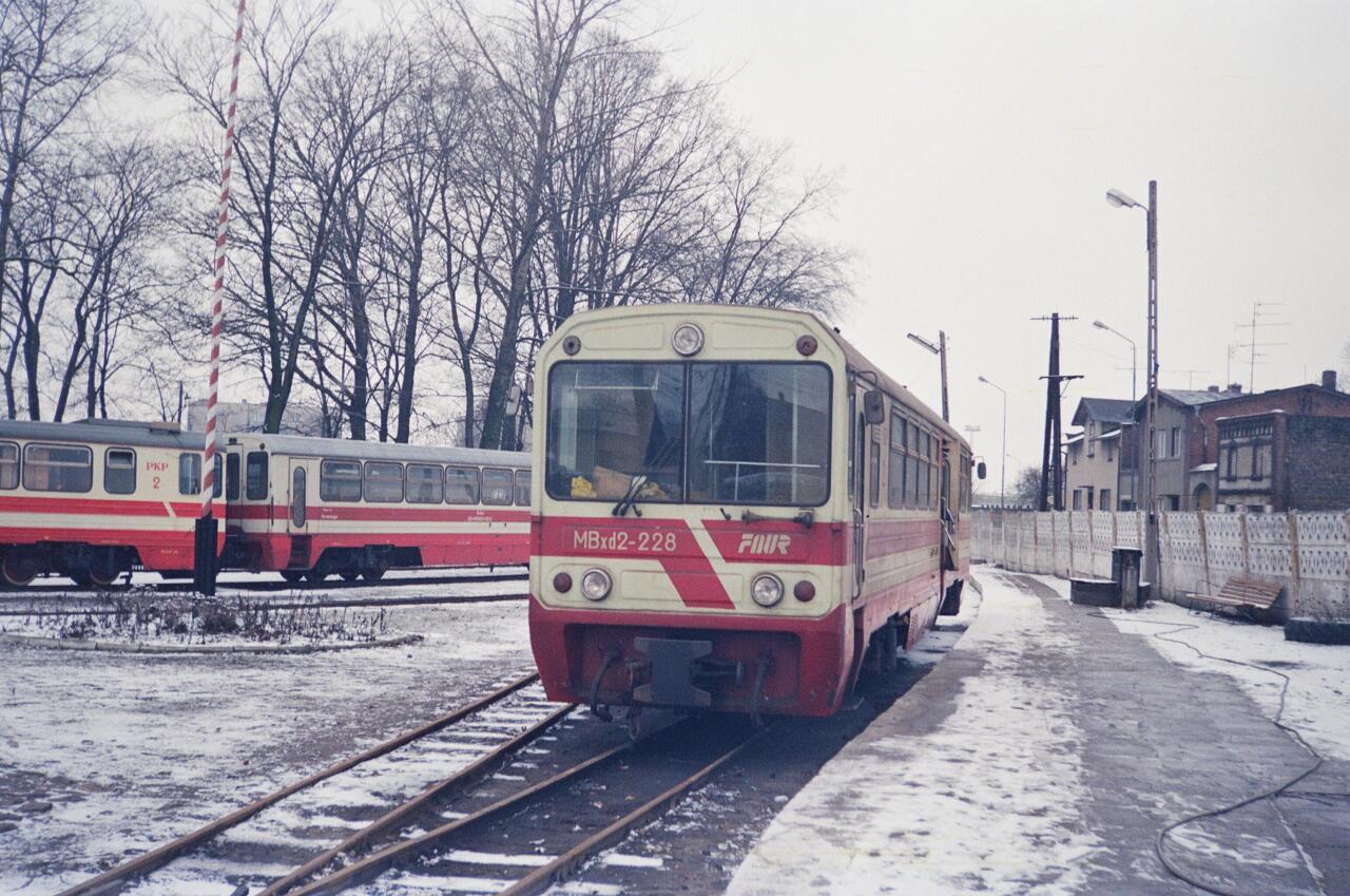 Pociąg MM 7603, obsługiwany wagonem spalinowym MBxd2-228 gotowy do odjazdu. Widoczny budynek stacyjny.