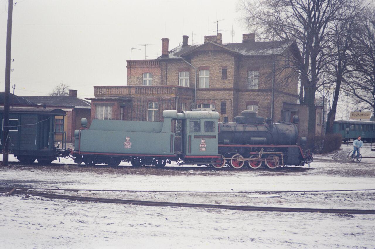 Stacja Opalenica Wąskotorowa - wygaszony parowóz Px48-1916. W prawo - kierunek Lwówek Wąskotorowy.
