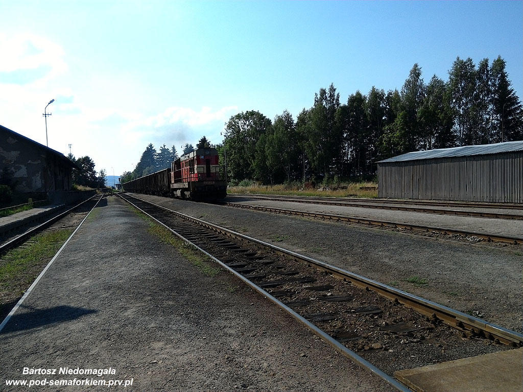Od strony Lichkov wjeżdża na stację skład towarowy prowadzony przez spalinowóz 742 21 - 0. Nie zatrzyma się tutaj, za chwilę skręci w lewo w kierunku Hanusovic. Z lewej fragment magazynu towarowego. Widok w kierunku zachodnim.