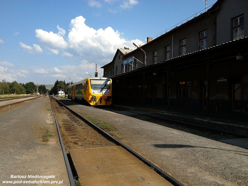 Szynobus 814 085 - 7, jako pociąg lokalny relacji Mlynicky Dvur - Lichkov. Z prawej budynek dworca. Widok w kierunku wschodnim, od strony wjazdu z Lichkowa i (dawniej) Międzylesia.