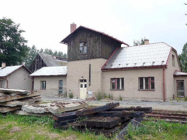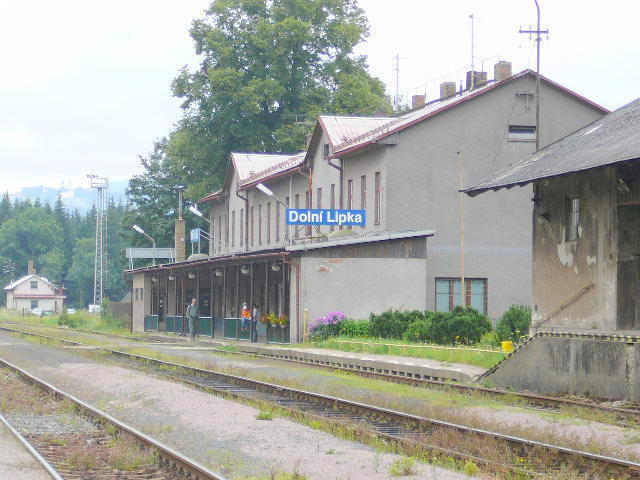 Dolni Lipka. Budynek dworca od strony peronów i wjazdu z Lichkowa i (dawniej) Międzylesia. Z prawej fragment magazynu towarowego. Widok w kierunku południowo-wschodnim.