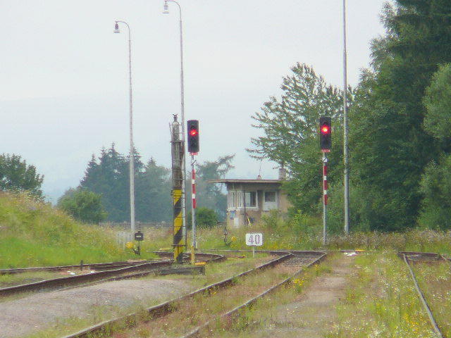 Dolni Lipka. Zachodnia głowica stacji i semafory wyjazdowe. W tle nastawnia wykonawcza nr 2. Widok w kierunku zachodnim: Lichkow, dawniej także Międzylesie.