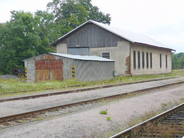 Dolni Lipka. Lokomotywownia i garaż. Z prawej, poza kadrem dworzec. Widok w kierunku północno-wschodnim, od strony wjazdu z Lichkowa i (dawniej) Międzylesia.