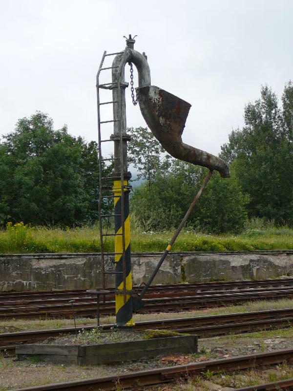 Dolni Lipka. Jeden z żurawi wodnych zlokalizowany w zachodniej części stacji. W tle rampa przeładunkowa. Widok w kierunku południowo-zachodnim: w lewo dworzec i perony, w prawo Lichkow, dawniej także Międzylesie.