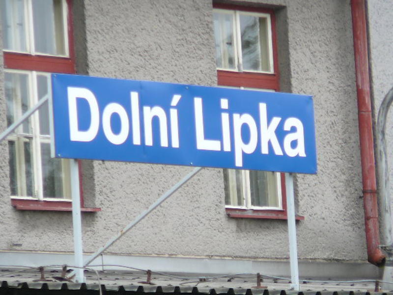 Dolni Lipka. Tablica z nazwą stacji na budynku dworca.