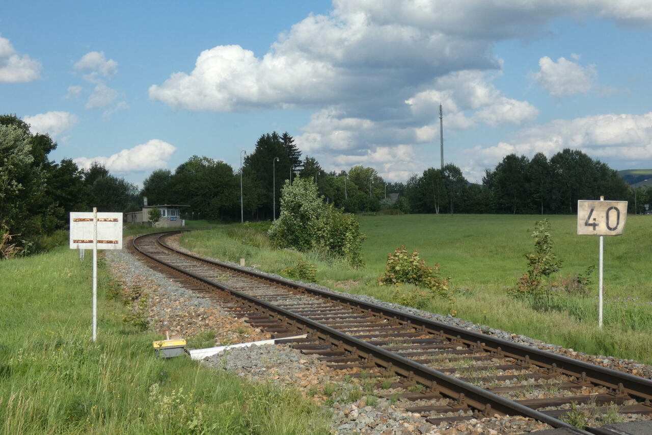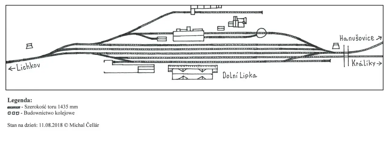 Dolni Lipka. Ziemne perony. Z prawej, poza kadrem dworzec. Z lewej, poza kadrem lokomotywownia i dawna wieża wodna. Widok w kierunku wschodnim: Kraliki, Hanuszowice.
