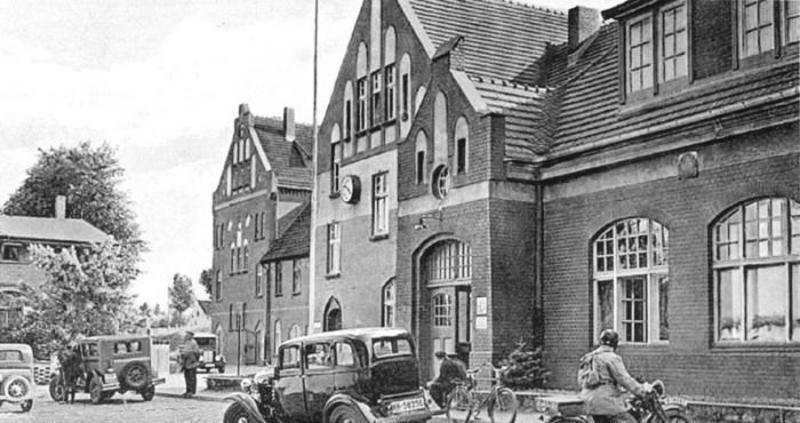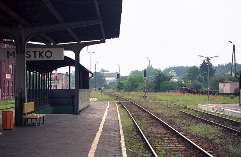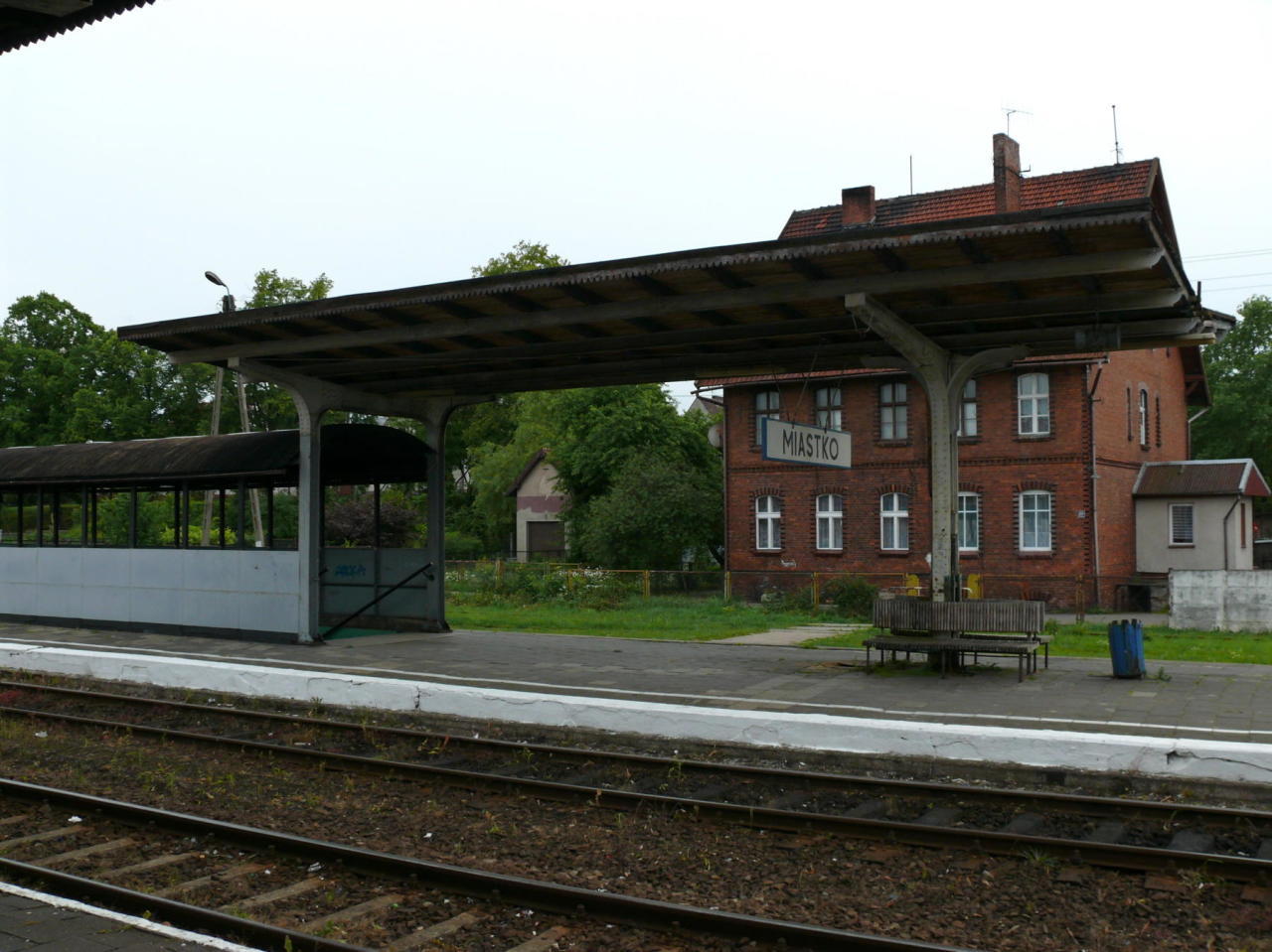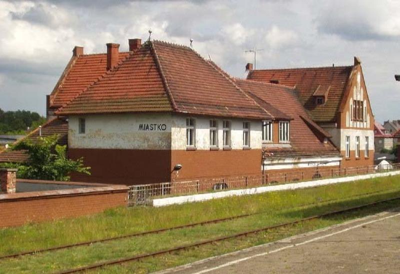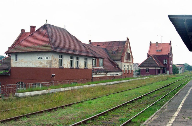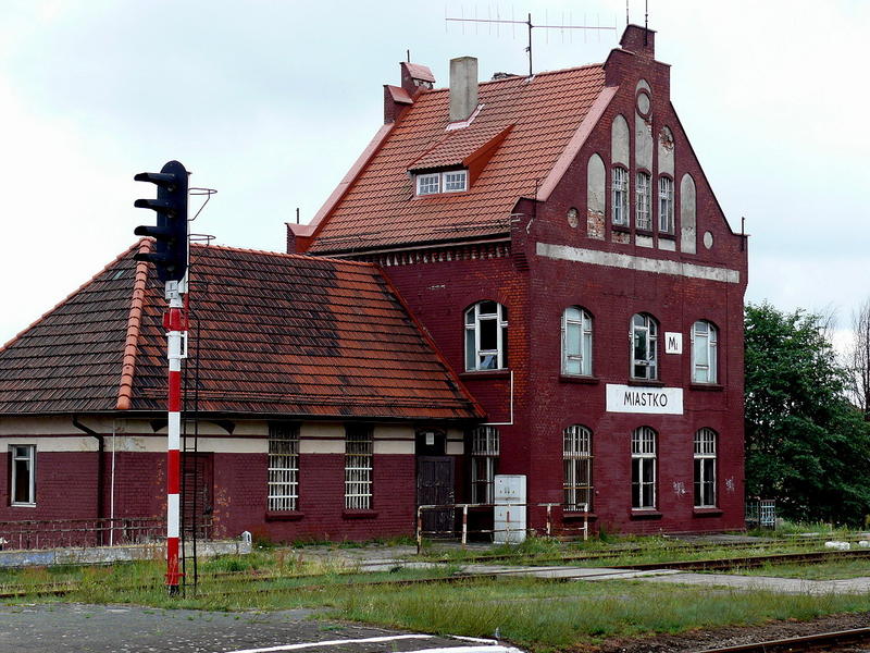 Pierwszy budynek dworca w Miastku. Widok od strony peronów w kierunku wschodnim: w lewo Korzybie/Słupsk, Bytów, w prawo Szczecinek, Człuchów (przez Słosinko).